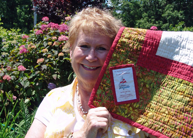 I just finished this nautical quilt.  Specially made for my Aunt Grier who lives on the water in Annapolis Maryland.  The inspiration came from Ashley's blog, Film in the Fridge.  Her easy tutorial is located here.  I was searching for something nautical but nothing that looked too sailboat like.  I wanted it to be subtle and this quilt did just that.  I got some fabric to match her living room chairs and then pulled those colors into the quilt throw.  The outcome was perfect.  I embellished with pearl cotton on the top by stitching through to the batting.  I used a chain stitch to create a rope-like effect that was flying the sails.  The backing was added after all the chain stitching was completed.  I did the quilting by hand, hence, the lap size.