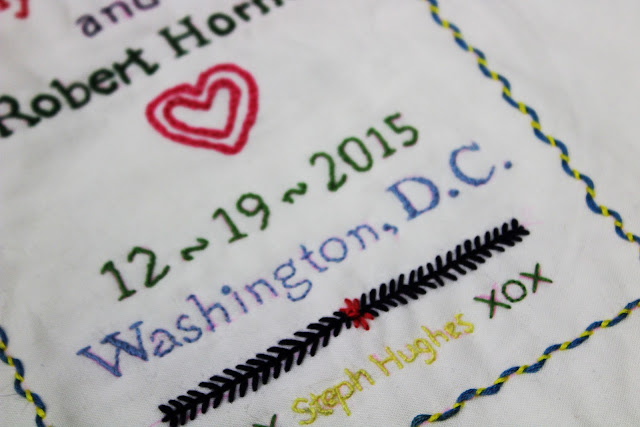 I always sign my quilts with a hand embroidered label that is personalized for the recipient.
