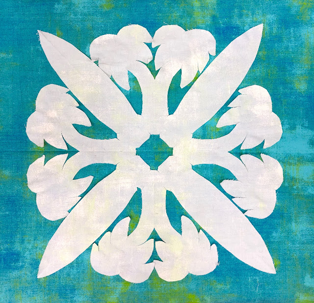 I used the same pattern and made three of them. Here is an example of one basted in place with thread and ready to hand applique it to the quilt top. I did not trim the quilt top away from the design.
